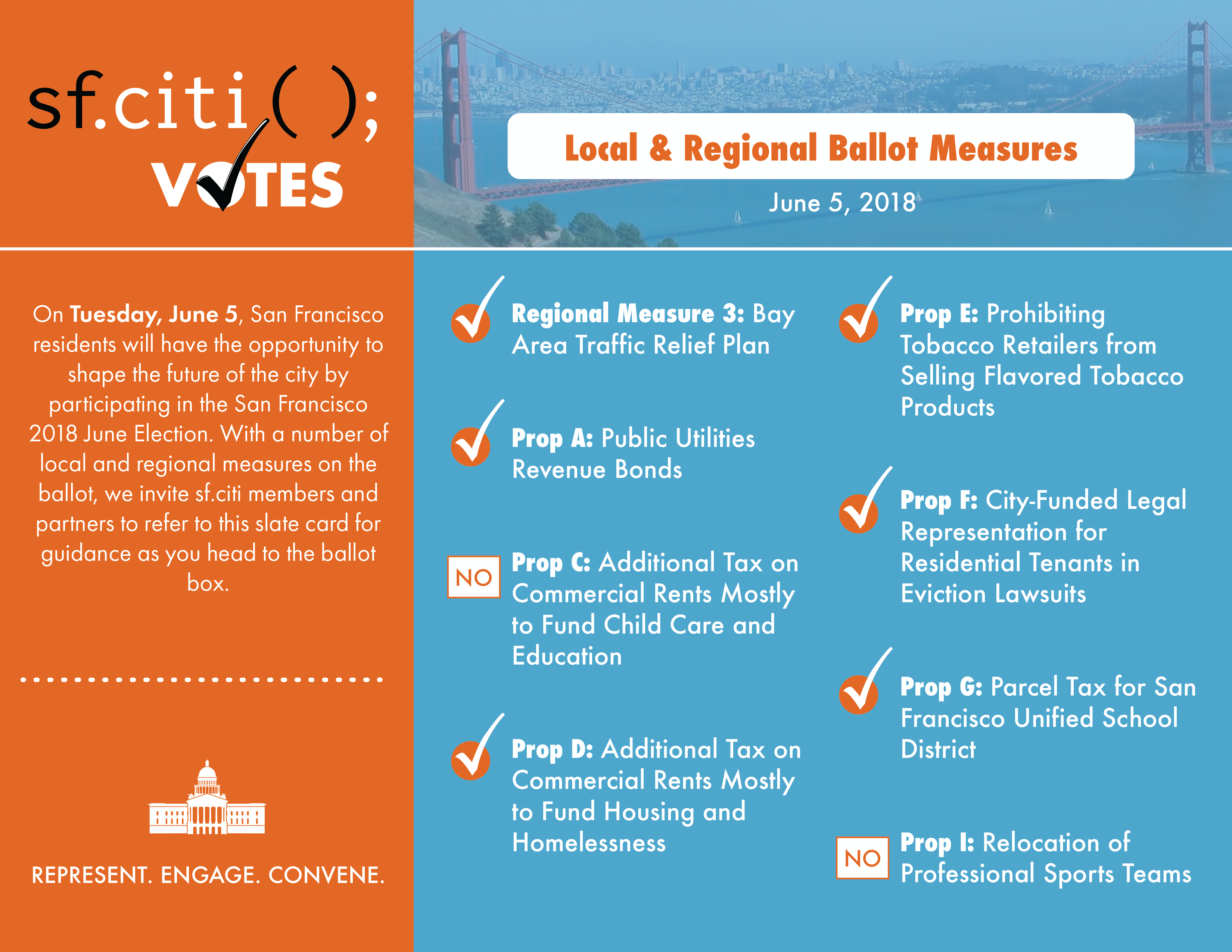 Here at sf.citi, we pride ourselves in being the glue that connects our technology sector to the community. We take this responsibility to heart when evaluating the many measures San Franciscans have been asked to decide on this June 5. Our endorsements balance the priorities of our member companies with the essential services our government should be providing that make San Francisco a livable place for all. We are proud to endorse the measures we recommend to you today, including a commonsense tax measure to create more affordable housing here in San Francisco. We are #OneCitySF.![]()
